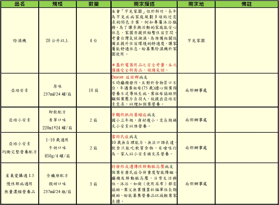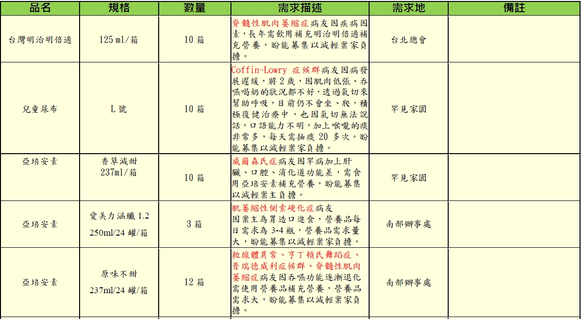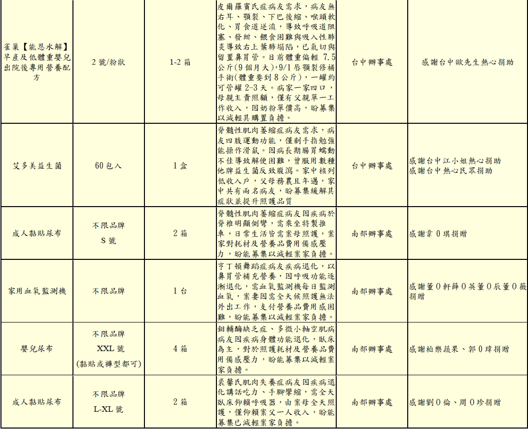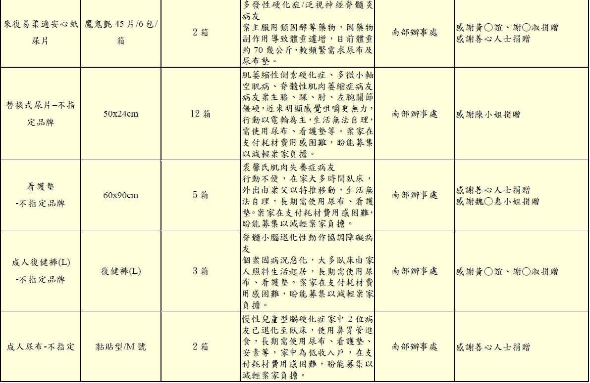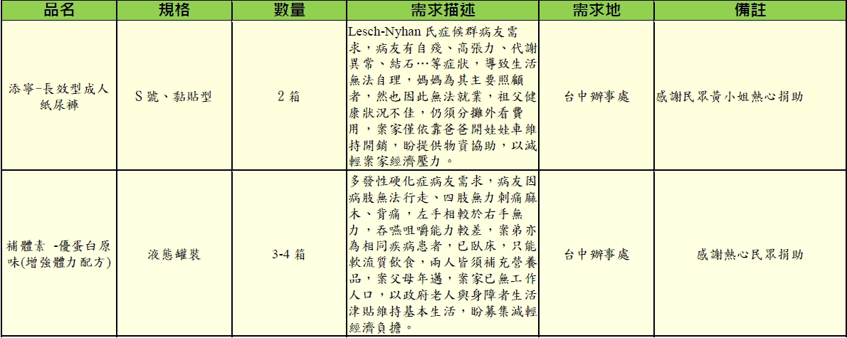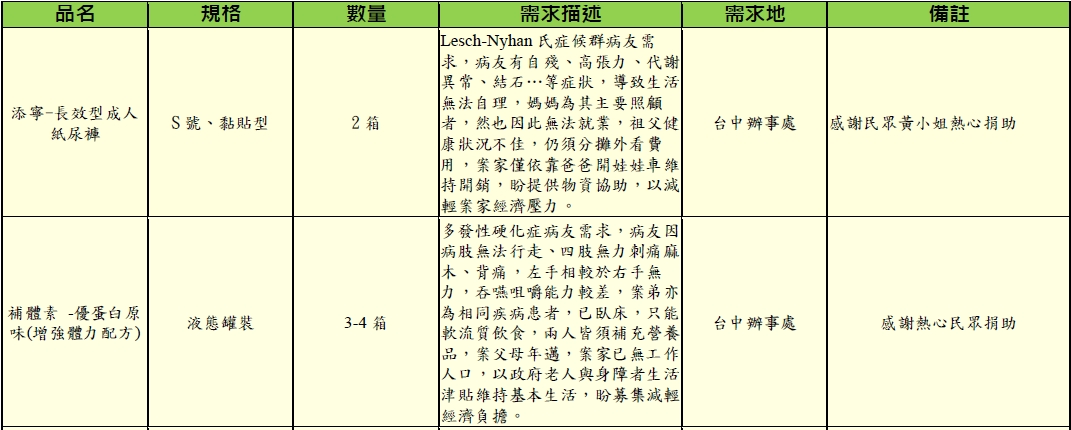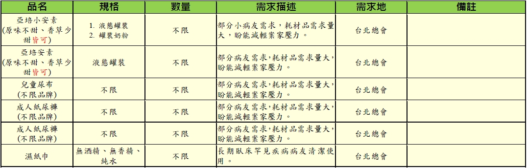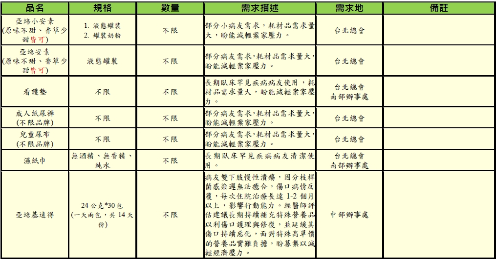 2.以下所列為本會目前急需之物資需求,如有民眾欲捐出其他不在列表之物資,也請先事前與本會活動公關組聯繫,以確認是否有重複或是病友是否有需要。