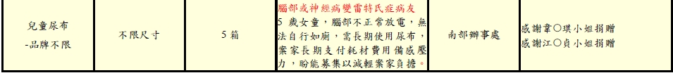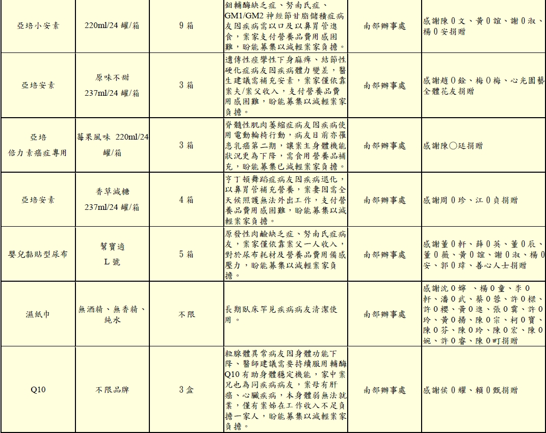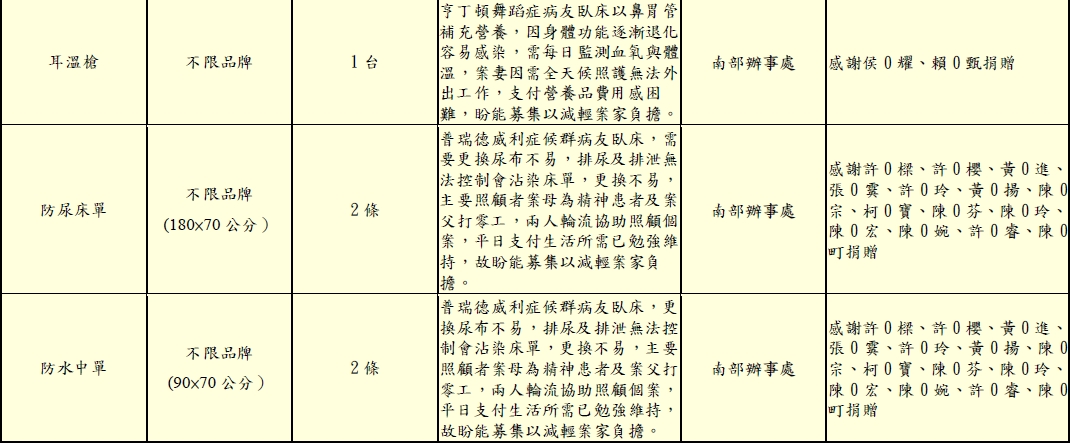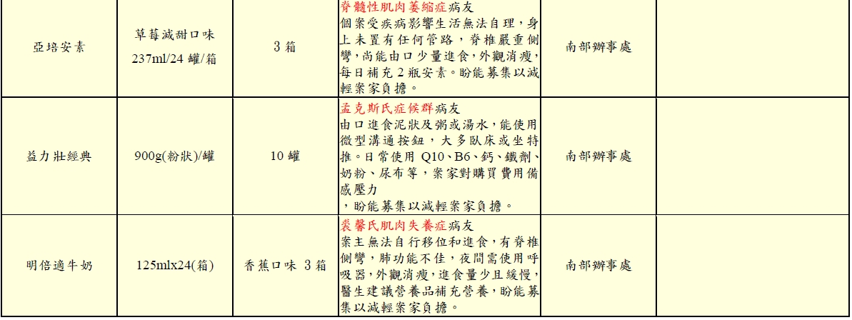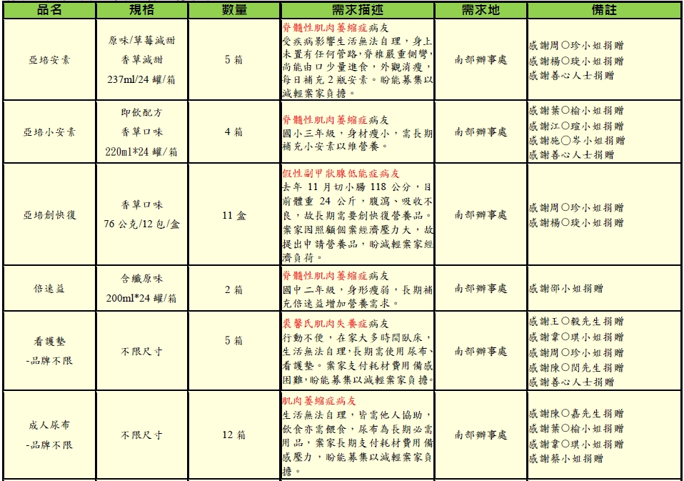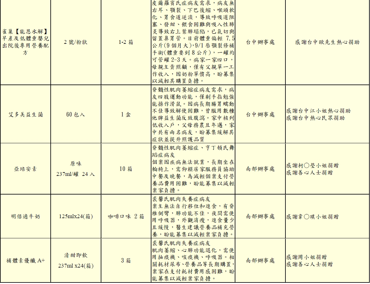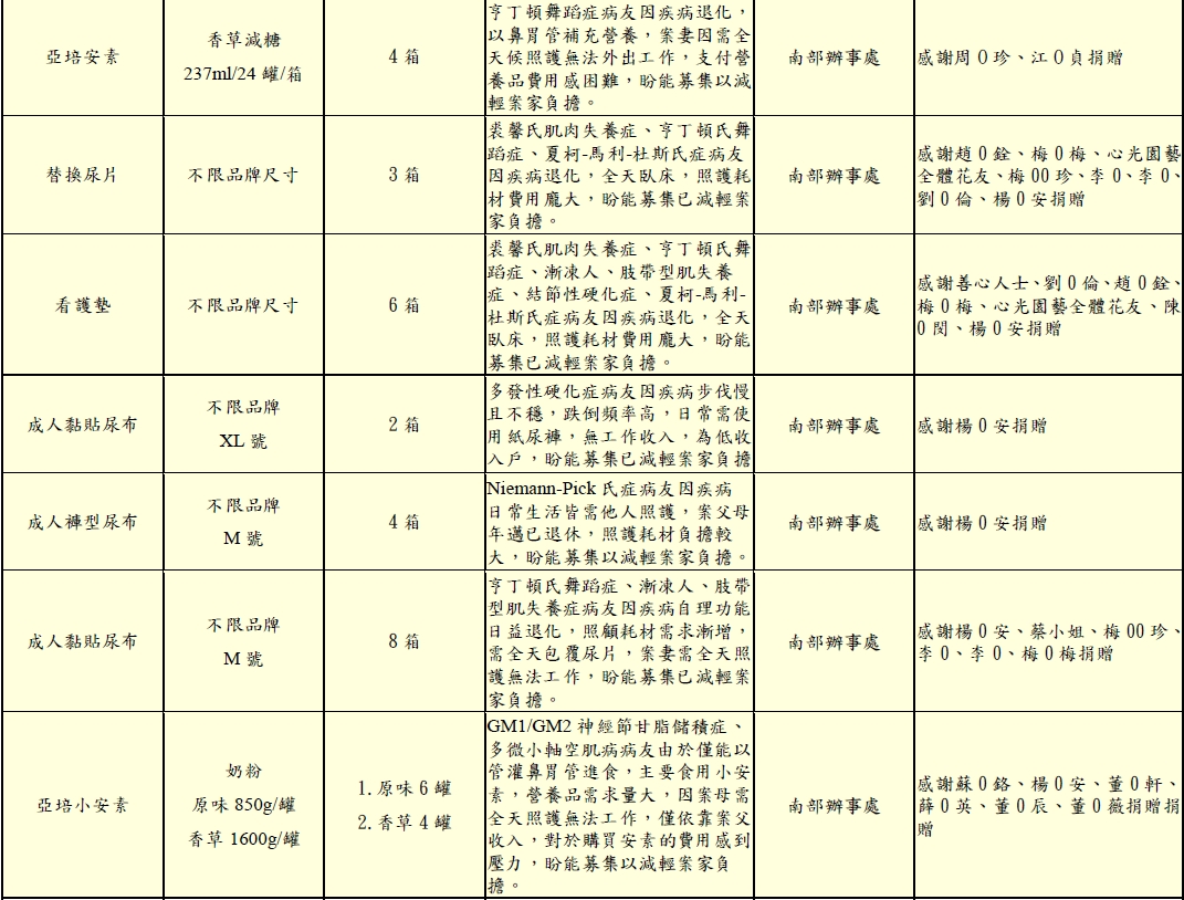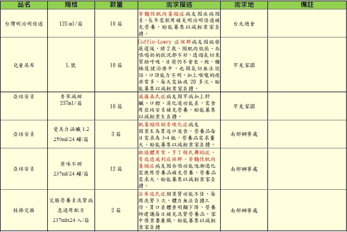 2.以下所列為本會目前急需之物資需求,如有民眾欲捐出其他不在列表之物資,也請先事前與本會活動公關組聯繫,以確認是否有重複或是病友是否有需要。