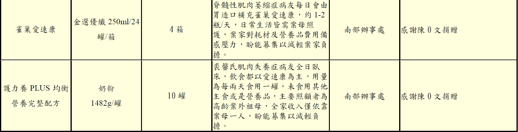 或許您手上有些堪用甚至幾近全新的二手物品,卻不知道可以送到哪裡給需要的人,或是您有意願協助罕見疾病家庭,提供特殊營養品、衛生用品等相關物資,以紓緩罕見疾病家庭家屬的經濟負擔。以下是本會目前所列出的物資需求清單,如果您手邊也有這樣的物品,歡迎您主動跟我們聯繫;至於如果是二手物品則請先行致電本會,以便讓你的愛心能夠真的幫助到需要的病友身上。