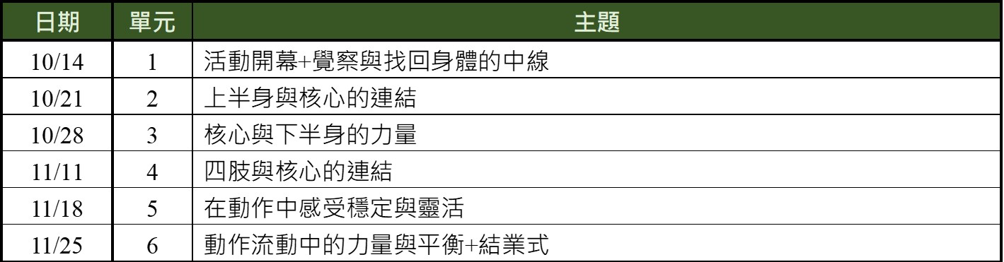 上課時間:預計10/14、10/21、10/28、11/11、11/18、11/25,(11/4停課乙次),每週二晚上7:00~8:00,共計6堂。