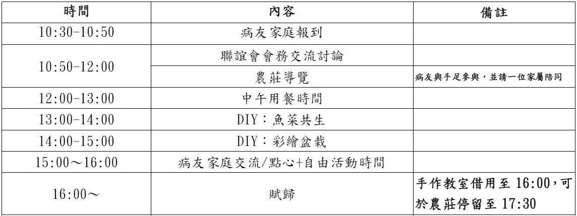 1、為鼓勵各地病友踴躍參與,本活動將依實際居住地提供外縣市病家交通補助 (定額補助,不含台中市病友家庭),至少需含一名病友,如僅家屬參與,則不提供補助。如有特殊需求,請來電洽詢。