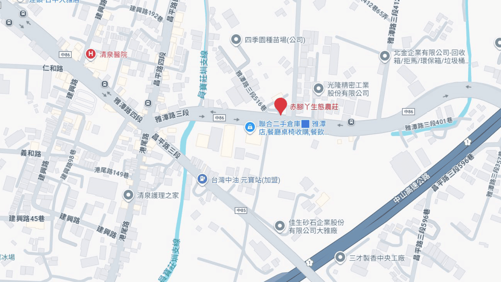 一、國道一號:中清交流道下,往台中市大雅區方向行駛「中清路」,行駛至中清路三段,右轉入「雅潭路四段」,往潭子方向前進。直行至五叉路口的紅綠燈後,左前方朝潭子方向行駛,約200公尺後迴轉,即可看到農莊。