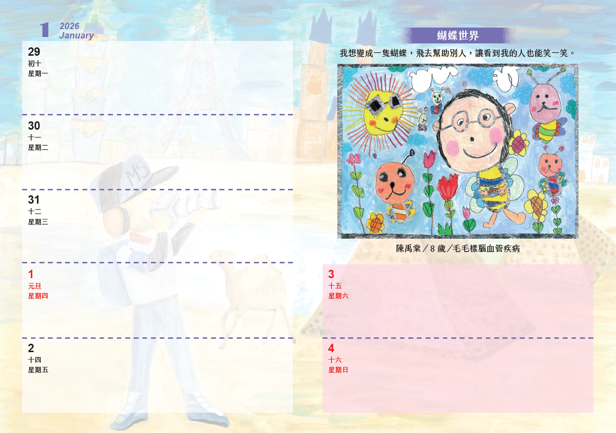 懇請您向親朋好友們分享推薦,讓病友親手繪製的年曆書被更多人看見。同樣沿襲往例,我們將於11月寄送予所有本會服務的【螢火蟲家族】成員一本「我的藝想世界」2026年曆書乙本,作為最深切的新年祝福。