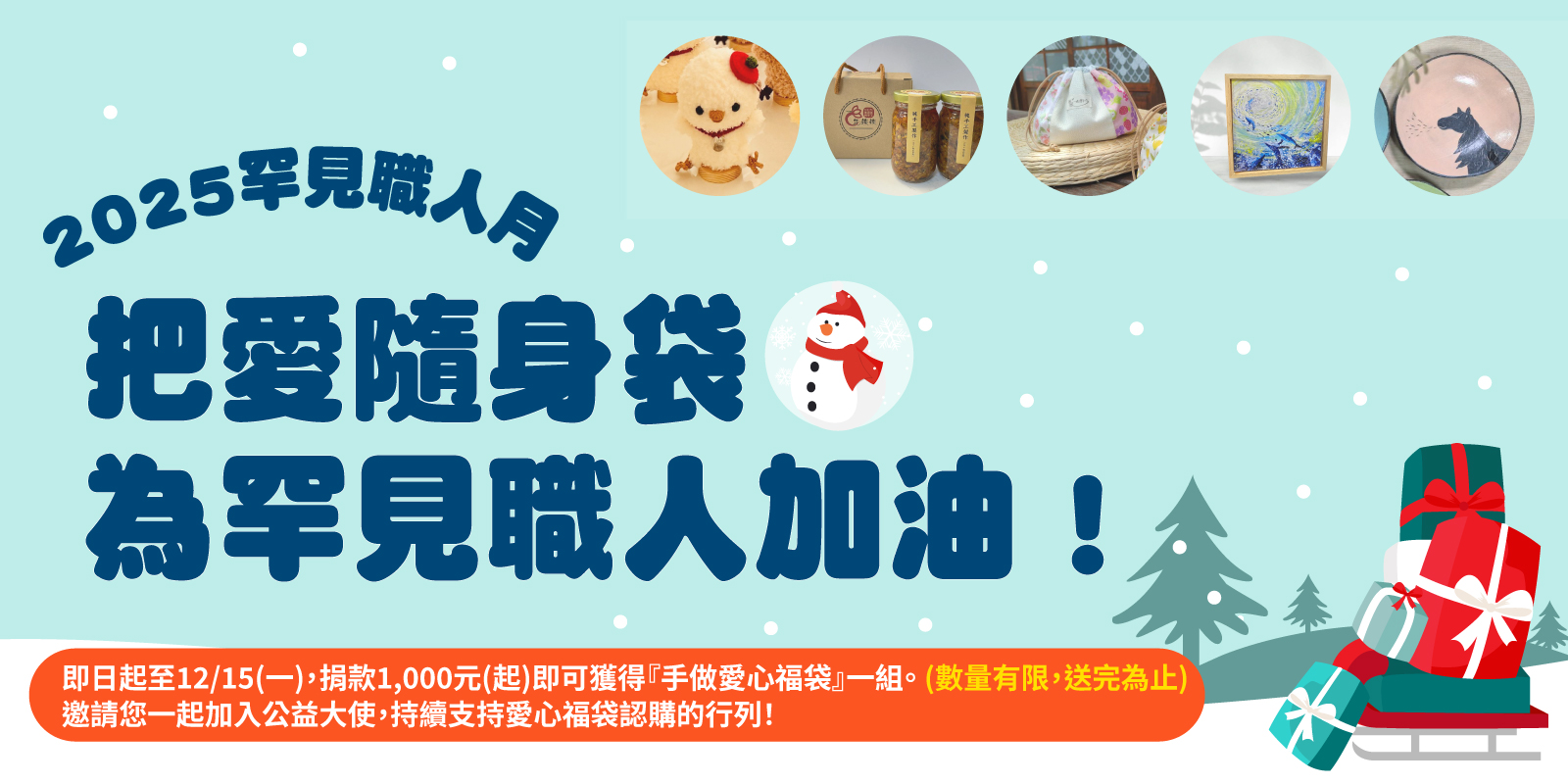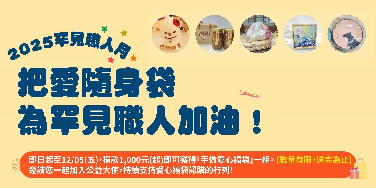 2025《罕見職人月》罕見疾病基金會再次邀您一起支持「罕見職人推展計畫」,只要您捐款就能響應職人愛心福袋,幫助更多職人建立自信拓展非凡人生!
