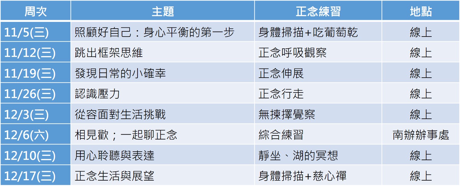 4. 正念減壓工作坊無法替代醫療行為與心理諮商,有任何身心方面問題請務必尋求適當之醫療及諮商心理師。