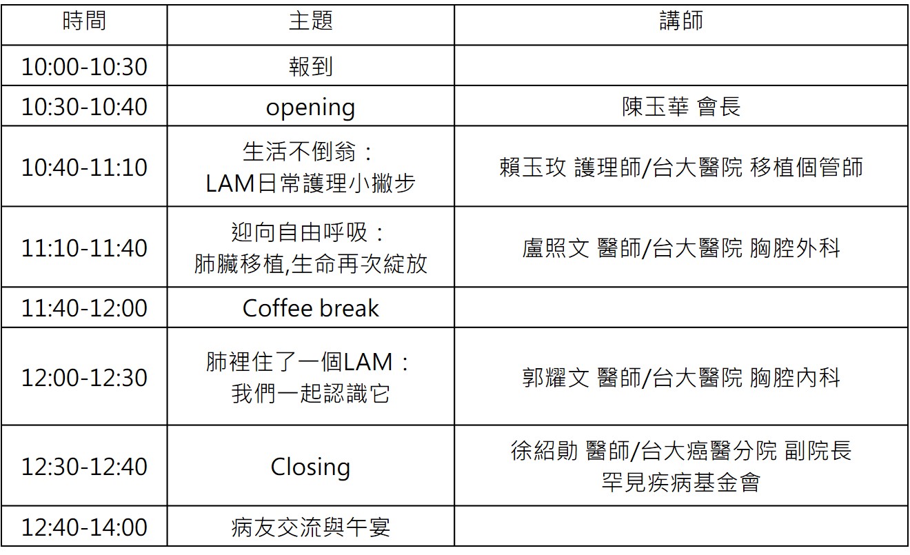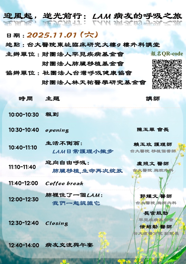 在充滿希望的季節裡,邀請您參加LAM病友聯誼活動。彼此相聚、互相交流、汲取新知的溫暖時刻,期待與您一同分享生命中的點滴與喜悅!