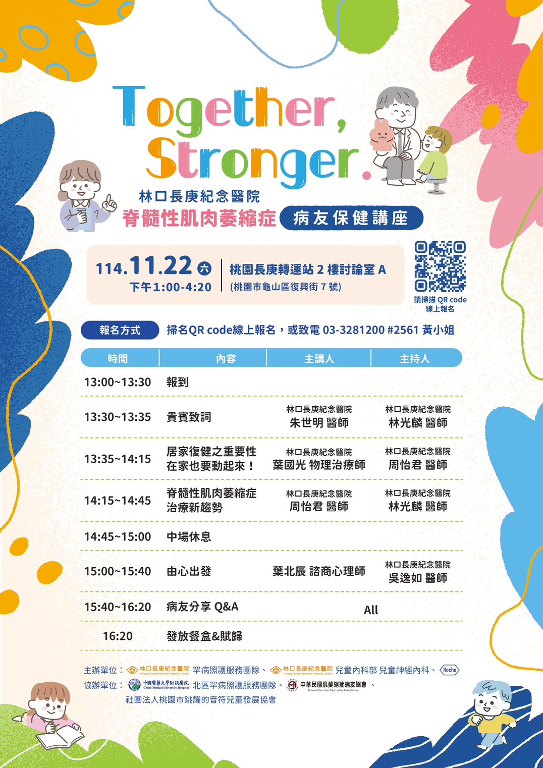 :中國醫藥大學附設醫院北區罕病照護服務團隊、中華民國肌萎縮症病友協會、社團法人桃園市跳躍的音符兒童發展協會