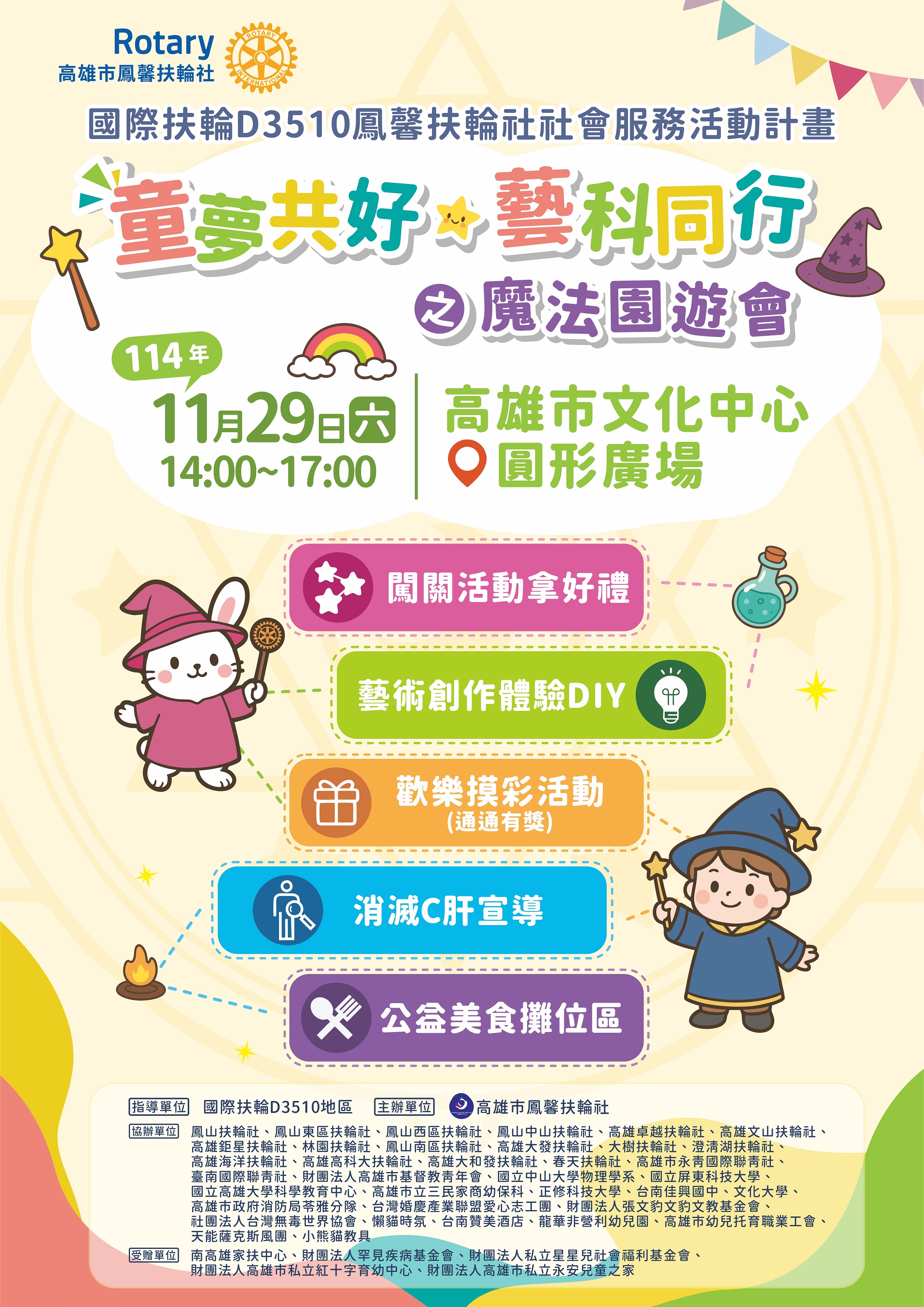 由高雄市鳳馨扶輪社主辦之童夢共好藝科同行之魔法園遊會再次盛大登場!此場公益嘉年華活動豐富多元,包含科學闖關活動、藝術創作DIY、公益美食區、C型肝炎防治宣導與免費檢測、消防體驗宣導,當日亦設有摸彩活動,豐富好禮等您來拿哦!誠摯邀請大家前來參加,一同為公益盡一份心力!