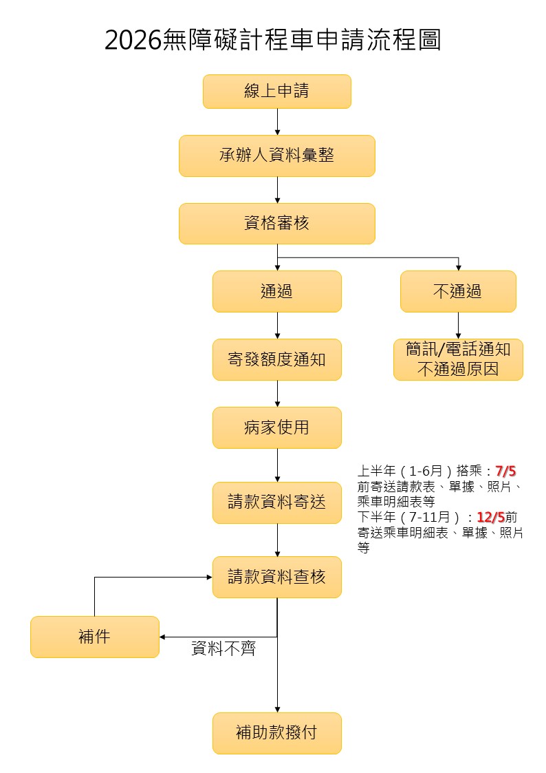 5、請款時檢附資料包括:請款表(第一次請款時務必檢附)、正本乘車收據、乘車明細表、115年度實際搭乘無障礙計程車照片(照片上需顯示拍攝日期),及其他經承辦人員通知須檢附之相關文件。