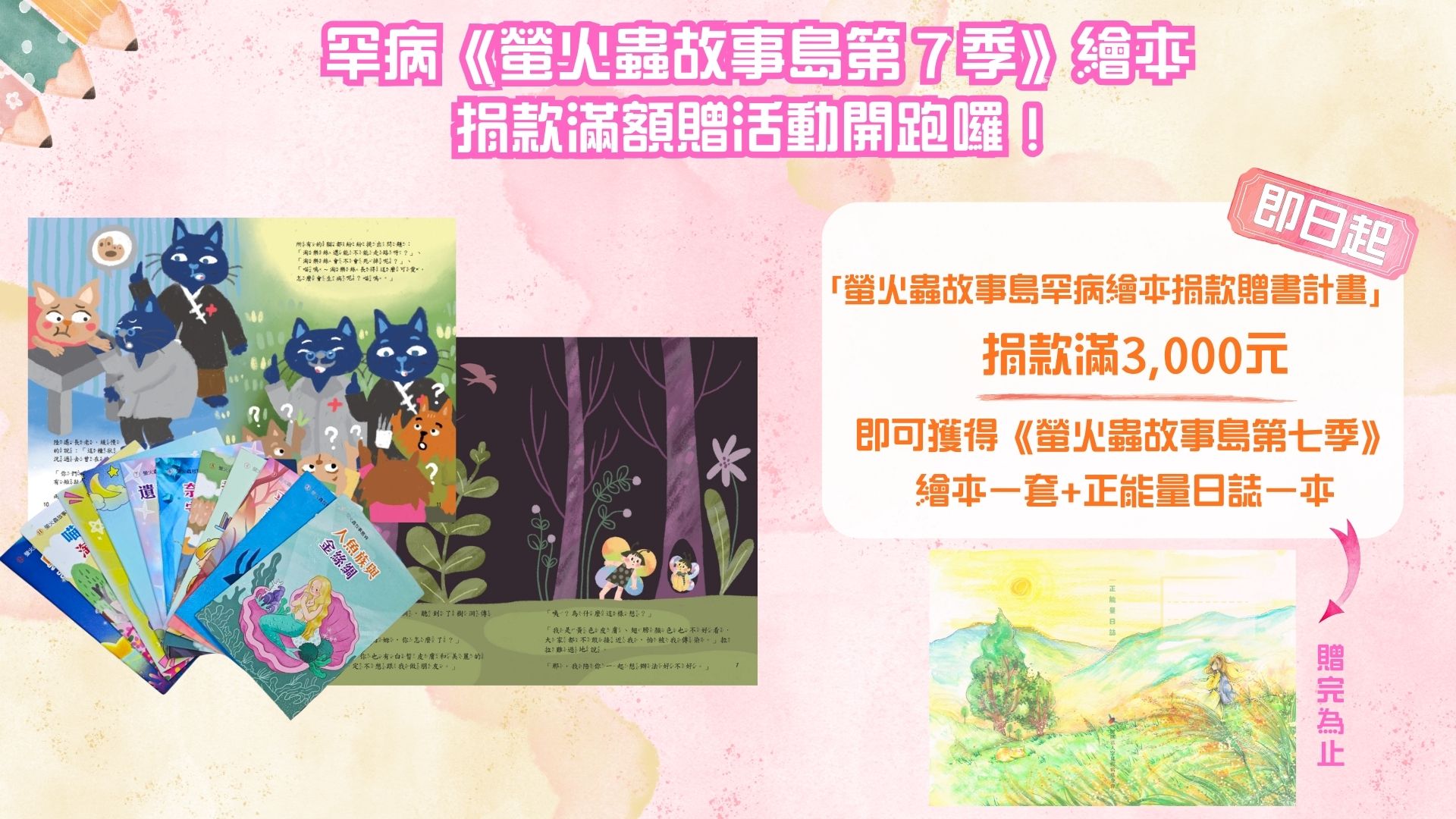 為讓這套優質繪本讓更多人擁有,「螢火蟲故事島罕病繪本捐款贈書計畫」即日起正式開跑,捐款滿3,000元,即可獲得《螢火蟲故事島第七季》繪本一套(12冊)+正能量日誌一本;捐款滿6,000元贈送兩套,以此類推,數量有限,贈完為止。誠摯邀請您一同響應,讓關懷被看見,讓愛不再罕見。