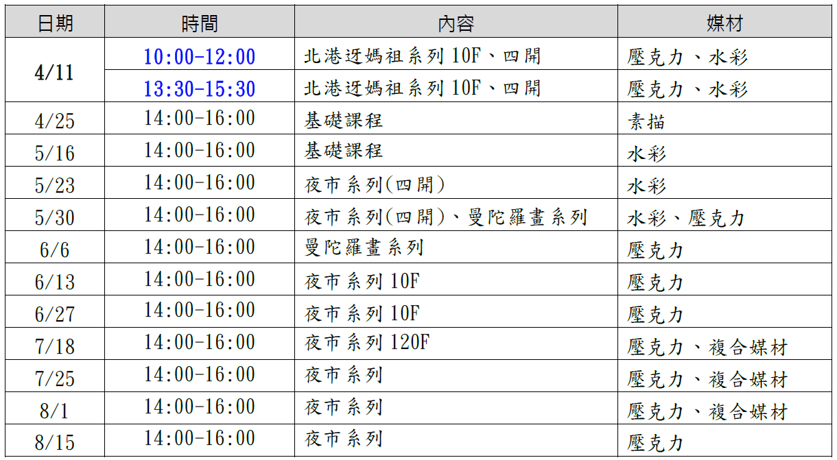 活動時間:4/11、4/25、5/16、5/23、5/30、6/6、6/13、6/27、7/18、7/25、8/1、8/15,星期六,共13堂。