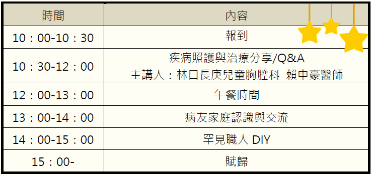 本會今年將於3月14日(六)舉辦先天性中樞性換氣不足症候群(CCHS)病友聯誼活動,當天上午安排醫療講座,下午安排聯誼交流時間及罕見職人DIY體驗,誠摯邀請您來與其他病友家庭相聚認識,一起創造美好的回憶。