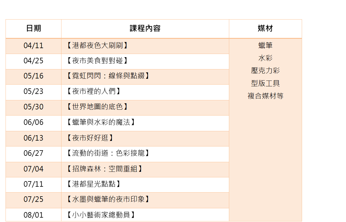 4/11、4/25、5/16、5/23、5/30、6/6、6/13、6/27、7/4、7/11、7/25、8/1,共12堂,每周週六下午14:00-16:00。