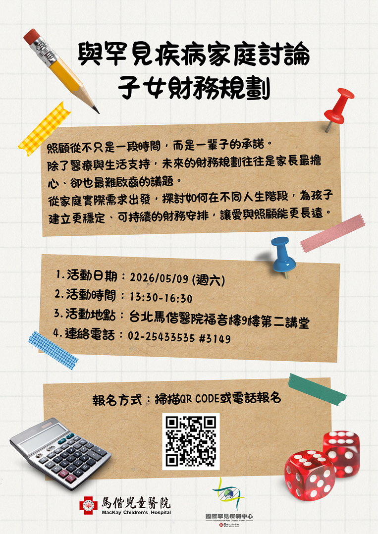 馬偕國際罕見疾病中心將在5月9日舉辦「與罕見疾病家庭討論子女財務規劃講座」活動,歡迎有興趣的罕病家庭報名。 活動時間:2026.05.09(六) 13:30-16:30 活動地點:台北馬偕醫院福音樓九樓第二講堂 (台北市中山區中山北路二段92號9樓) 報名連結:https://forms.gle/j3MtEjFo1xw68dsr7 主辦單位:馬偕醫院 國際罕見疾病中心 聯繫方式:(02)2543-3535 分機3149