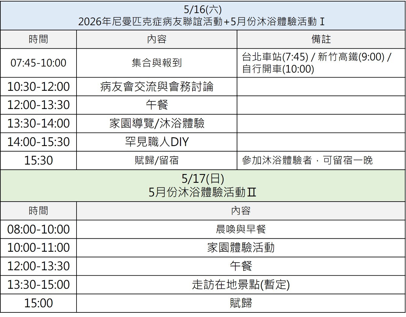 5月16日(六)將於罕見家園辦理「2026年尼曼匹克症病友聯誼活動」,安排病友家庭彼此認識與交流。