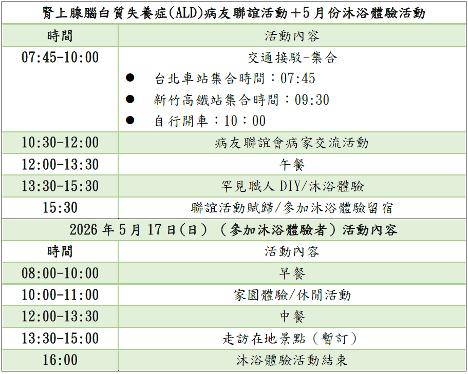 本會今年將於5月16日於新竹罕見家園舉辦「2026腎上腺腦白質失養症(ALD)病友聯誼活動」,安排病友家庭彼此互相認識與交流、罕見職人DIY體驗,動動手腳等活動等,內容豐富又有趣!誠摯邀請您來與其他病友家庭相聚認識,一起創造美好的回憶。