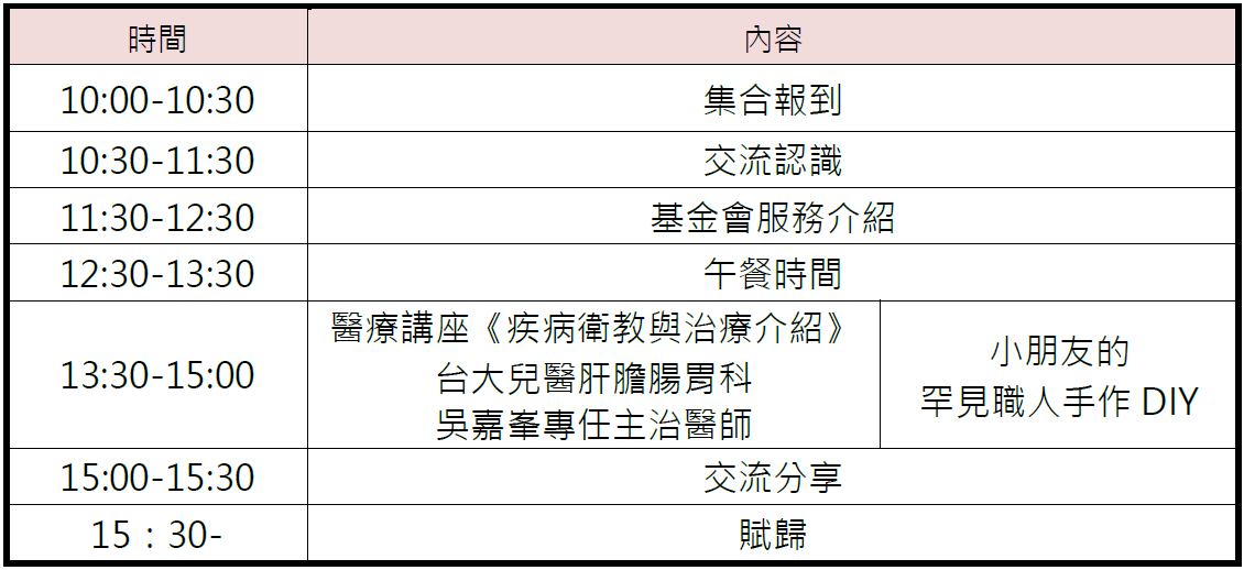 活動對象:進行性家族性肝內膽汁滯留症 、阿拉吉歐症候群、先天性巴特氏症候群、Gitelman氏症候群、亞伯氏症候群病友及家屬。