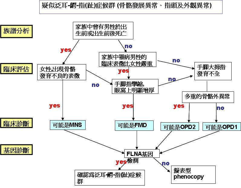 在診斷上主要為遺傳專科醫師根據個案的臨床表徵進行診治,並配合相關影像學檢查、家族譜分析,此外可經分子生物技術進行基因檢測(診斷建議流程可參考下圖)。FLNA為目前已知與此症相關的的基因,相關檢測內容如下: