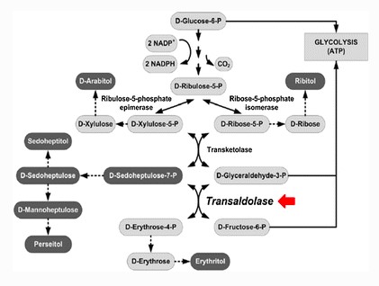 轉醛醇酶(TALDO)缺乏症(OMIM 606003)是一種罕見的磷酸戊糖途徑(pentose phosphate pathway,PPP)的先天代謝缺陷,由位於11p15染色體上的 TALDO1 基因的致病性變異所引起。磷酸戊糖途徑(PPP),存在於肺、肝、乳腺、大腦、腎上腺皮質和皮膚等組織中。 PPP分為氧化和非氧化兩個部分,負責產生NADPH和核糖用於合成核糖核酸(RNA、DNA)和三磷酸腺苷(ATP)。 TALDO是非氧化部分的第二種酶,可在PPP和糖酵解之間建立可逆連結。該酶催化三碳酮醇單元從景天庚酮糖 7-磷酸(sedoheptulose 7-phosphate)可逆的轉移到甘油醛3-磷酸(glyceraldehyde 3-phosphate),形成赤蘚糖4-磷酸(erythrose 4-phosphate)和果糖 6-磷酸(fructose 6-phosphate)。在轉醛醇酶缺乏症中,景天庚酮糖 7P 會堆積,且核糖 5P無法再循環,導致 NADPH 和穀胱甘肽(GSH)缺乏、脂質氫過氧化物(lipid hydroperoxides)濃度增加,粒線體跨膜電位喪失。因此在 TALDO 缺乏症中,許多代謝產物在尿中濃度會提高。