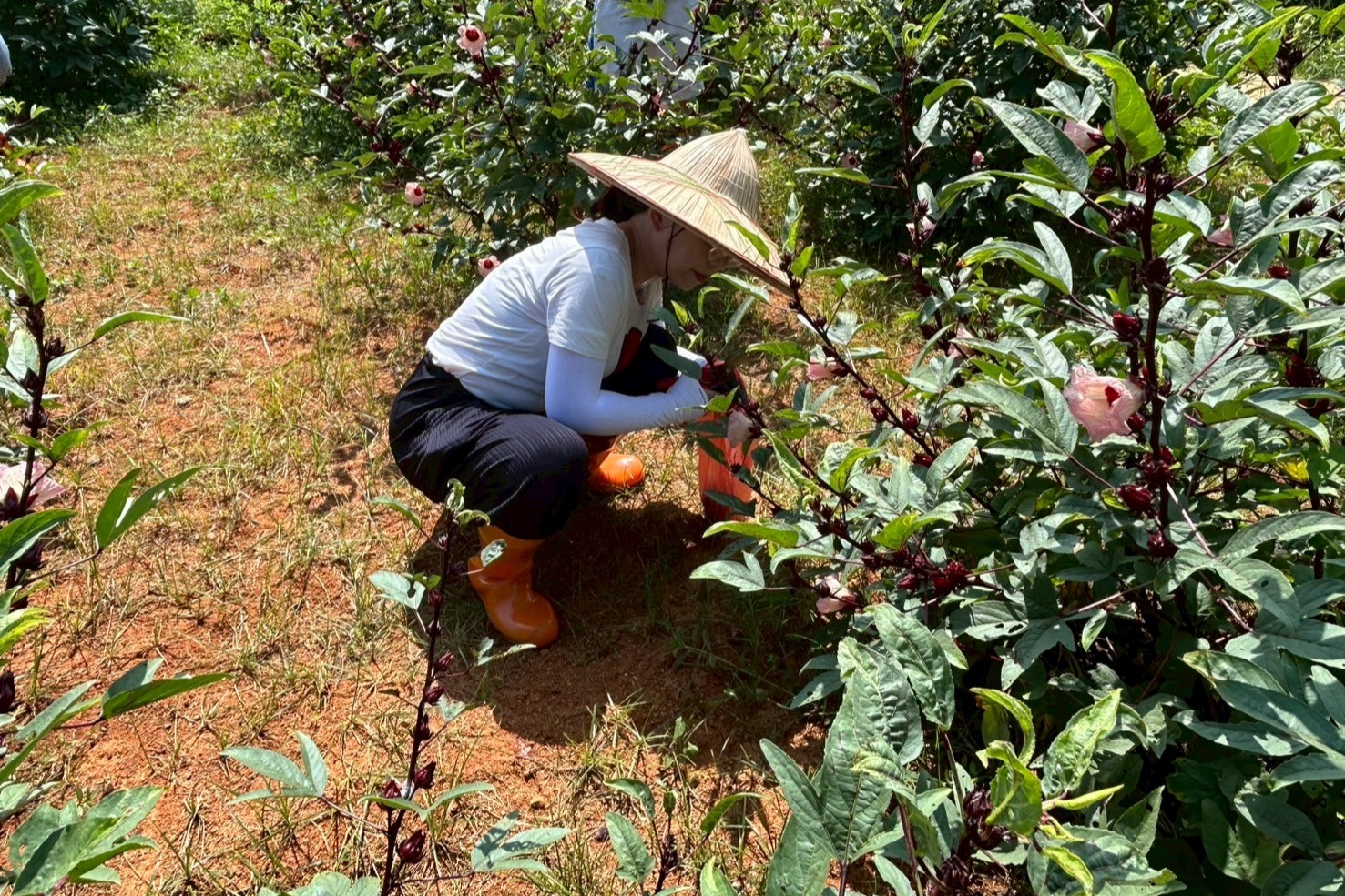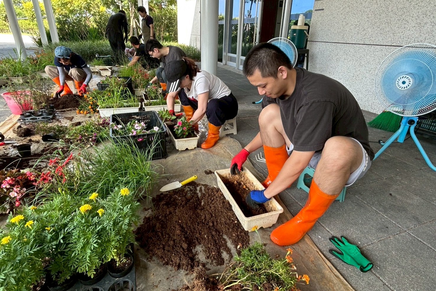 至於9/17(三)15位聯電志工來到家園,大家不畏天氣的炎熱,一起將車道兩側的花盆翻新並栽種新的花卉,大家一邊閒話家常一邊忙碌手邊的花盆,時不時伴隨著看見蚯蚓及蟲子的尖叫聲,讓整個氛圍變得更輕鬆有趣。當將所有的花卉都種植完後,大家更戴上了斗笠、穿上了雨鞋,一起到農地裡採摘家園剛成熟的洛神花,採摘完大家也帶了一部分回家泡茶,當成愛心志工的小小福利。