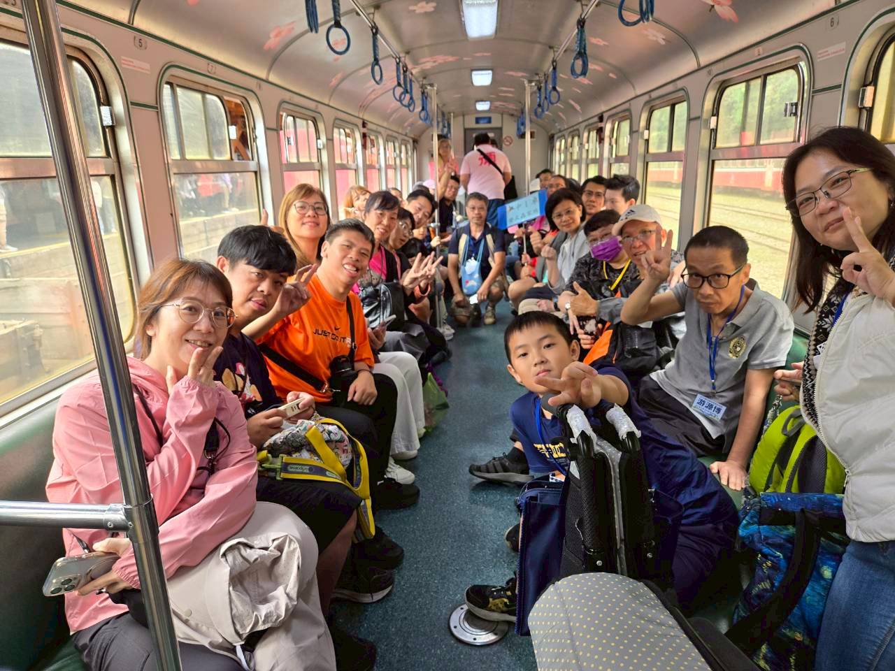 第二天一早則是此次活動的重頭戲,六台遊覽車浩浩蕩蕩出發,載著240多位病友與家屬勇闖阿里山。這是本會首次挑戰如此龐大的隊伍上阿里山,特別安排阿里山小火車專列,讓77個罕病家庭一同搭乘前往沼平公園站。雖然只是短短6分鐘的車程,但窗外壯麗的山景令大家心醉不已。許多家屬動容地分享:「平常根本沒有機會能帶孩子來阿里山,更別說搭乘小火車了。」幸運的是,天空作美,讓這段難得的半日山林之旅能順利完成。
