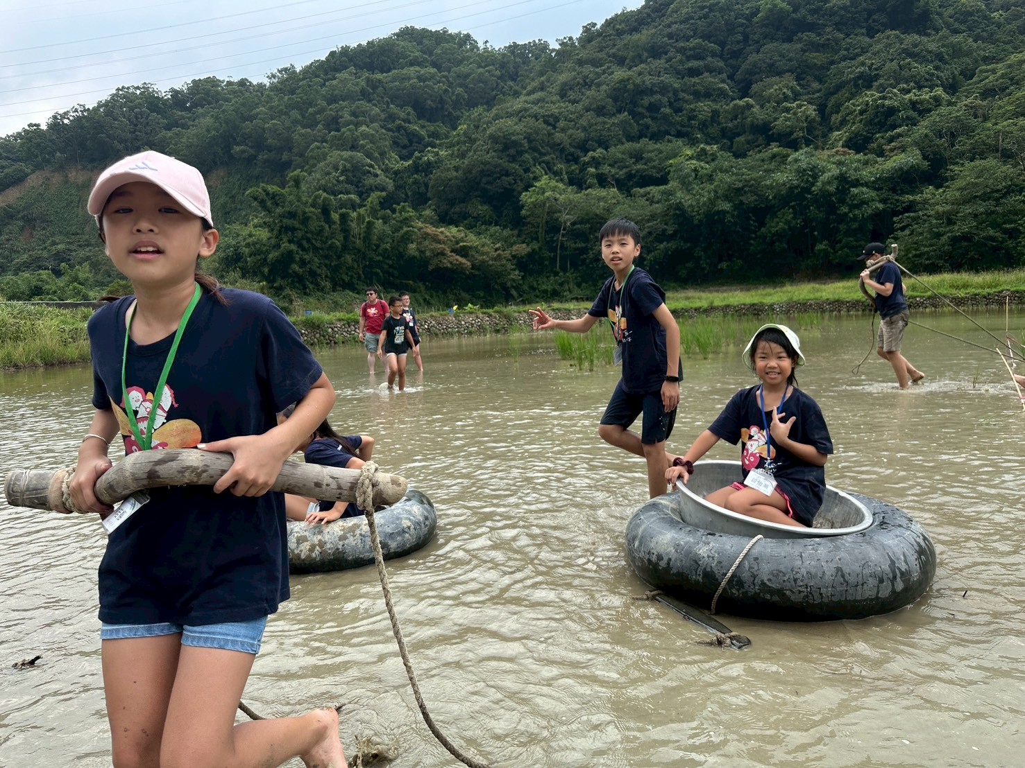 隔天早上收拾完帳篷,大家前往鄰近的水牛學校,這是一間充滿故事的學校。李校長致力於台灣水牛復育,也推廣水牛療癒課程,期盼未來水牛也能像馬術或寵物一樣,成為一種療癒工具。初到校園時,青少年們對戶外環境有些陌生,但在校長熱情引導下,逐漸放開心房,從撫摸水牛、牽引到嘗試騎乘,每個動作都充滿著新鮮感。最受歡的則是「罕見水田盃」競賽,青少年們揹著牛軛,光著腳丫在泥田中行走、奔跑,即使有人不慎跌進泥裡,全身泥濘仍笑得開心。