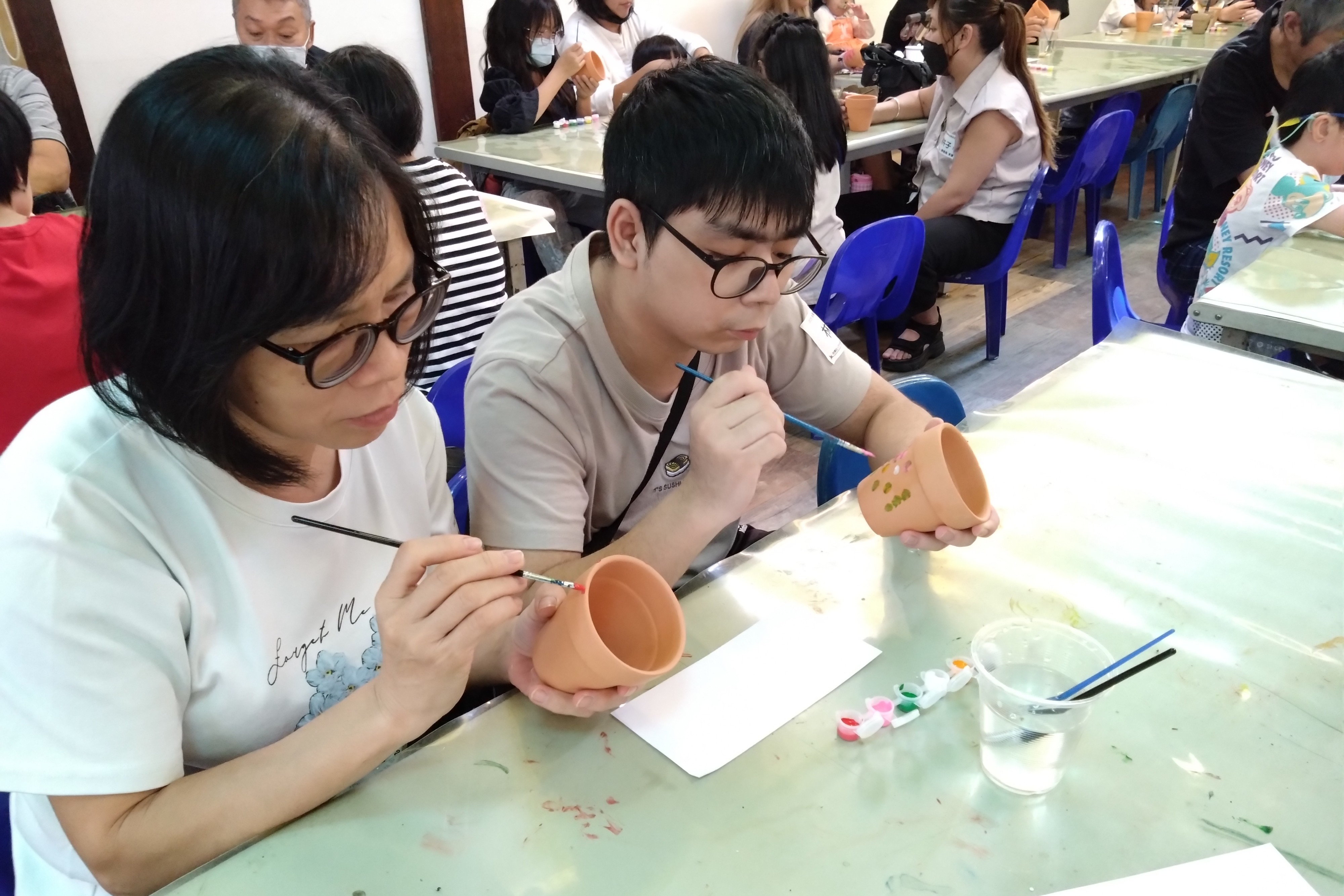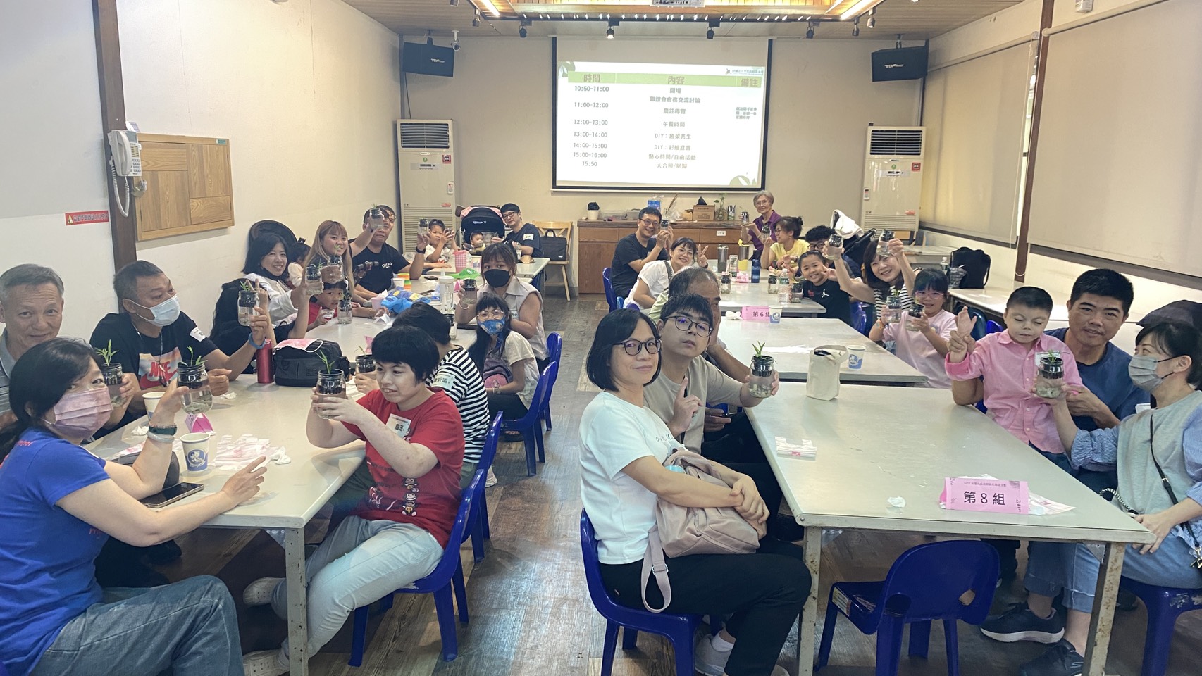 上午首先進行生態導覽活動,園區內可見許多可愛不怕生的動物朋友,有可以近距離接觸的白色羽毛烏骨雞、小山羊、達可鴨與療癒長耳兔等小動物,園區種植各式各樣的蔬菜與植物,病友和手足有機會滿足對自然的好奇與尊重、寓教於樂,也讓來自全台各地,平日僅能透過線上line群組與臉書社團互動的家長們,與此同時把握互相交流分享時間,每個家庭都得以在自然環境下放鬆、獲得喘息。下午魚菜共生與彩繪盆栽等手做DIY,透過農莊楊副理生動活潑解說,全家一起動手做、不僅進親子交流,藉此提升病友和手足的專注力與耐心。
