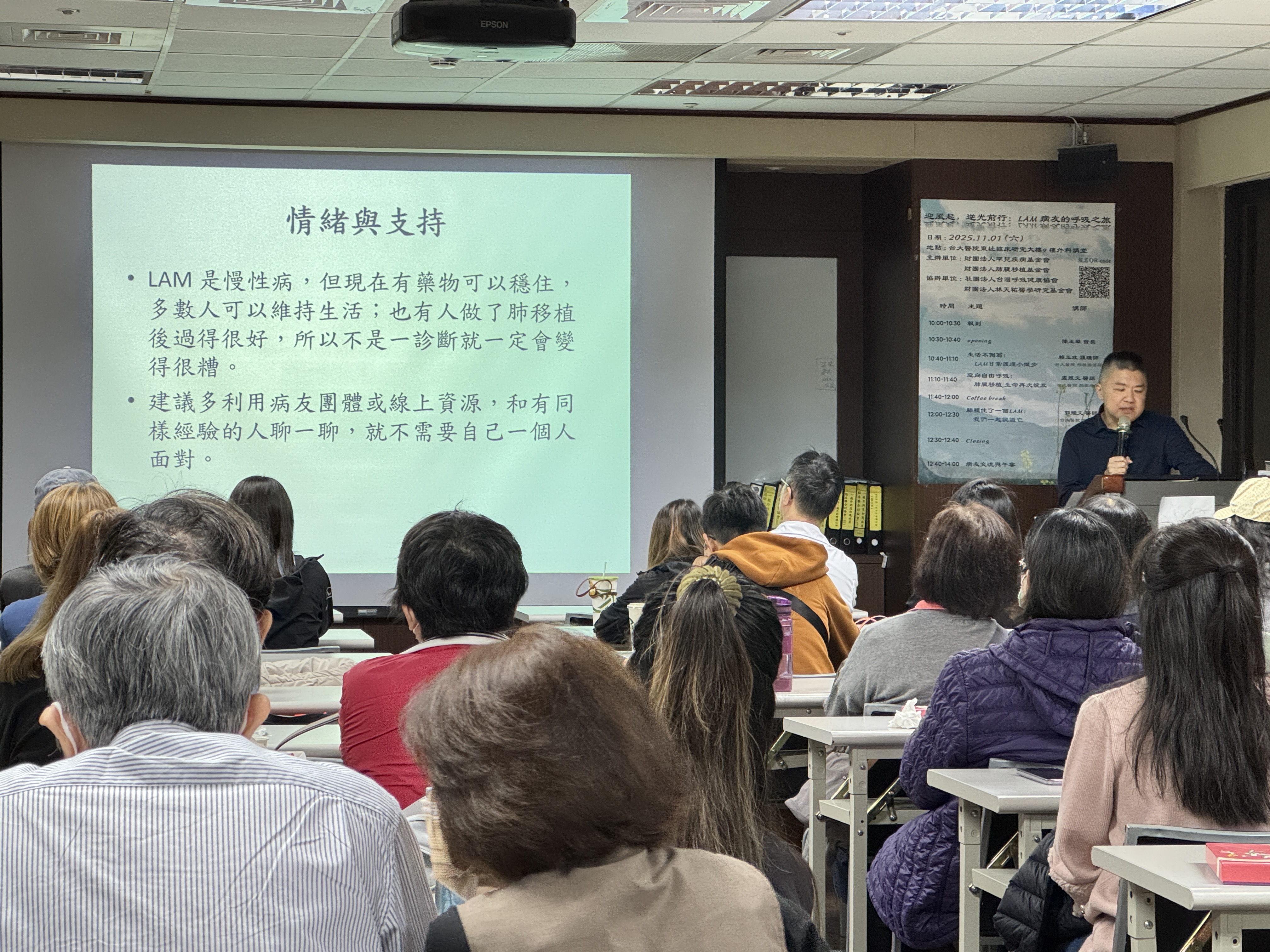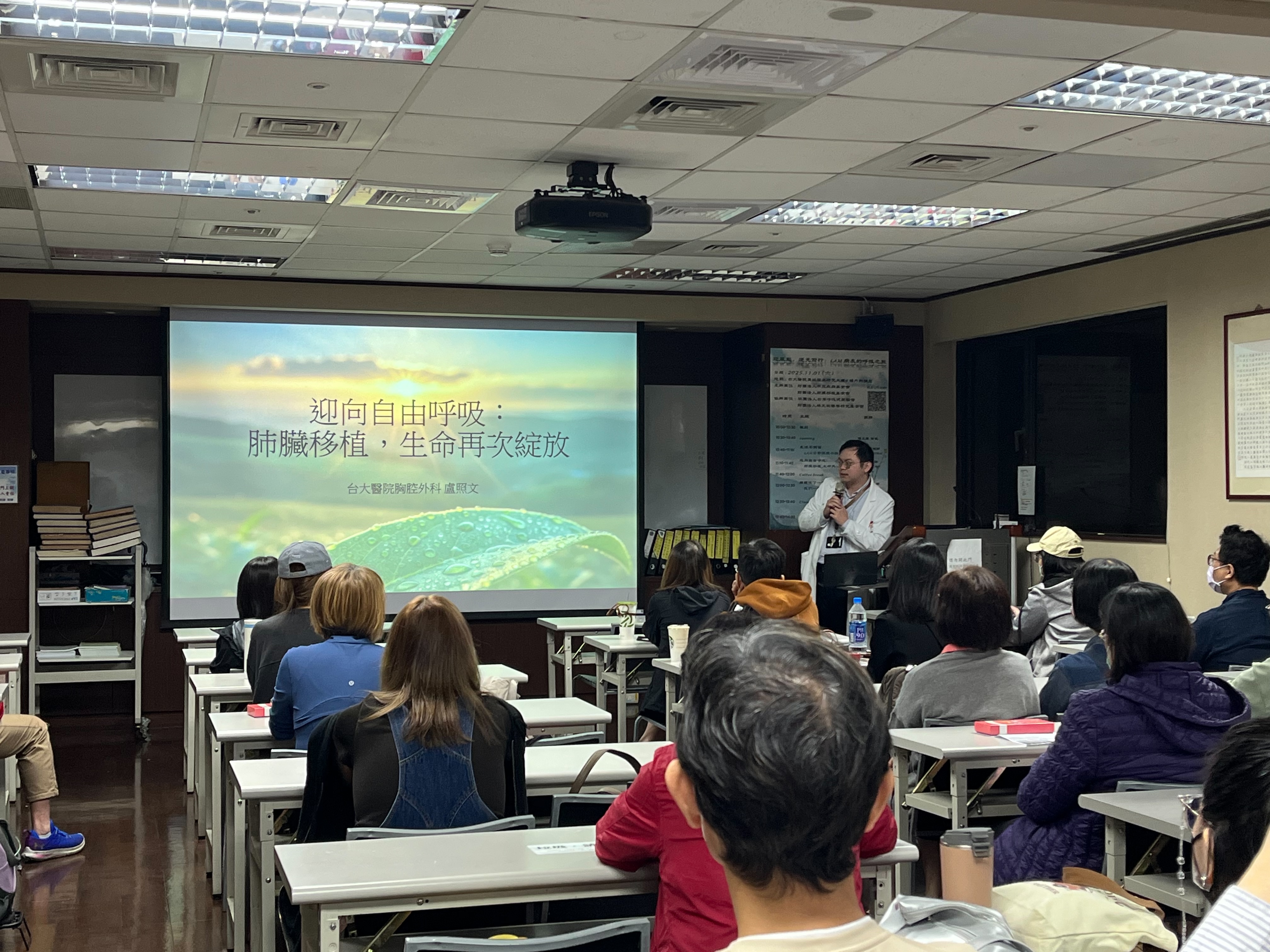 此次講座中,臺大醫院團隊分別分享多面向的照護資訊,如賴玉玫護理師以日常生活為主軸,介紹病友如何從飲食與運動進行自我照護,並提醒預防呼吸道感染等重要事項。接著是胸腔外科盧照文醫師說明肺臟移植手術流程,協助病友了解病程進展至需評估移植時的術前準備與術後復健重點。緊接著是胸腔內科郭耀文醫師整理疾病追蹤與藥物治療在不同階段的注意事項,幫助病友在治療中更穩定地調整生活。