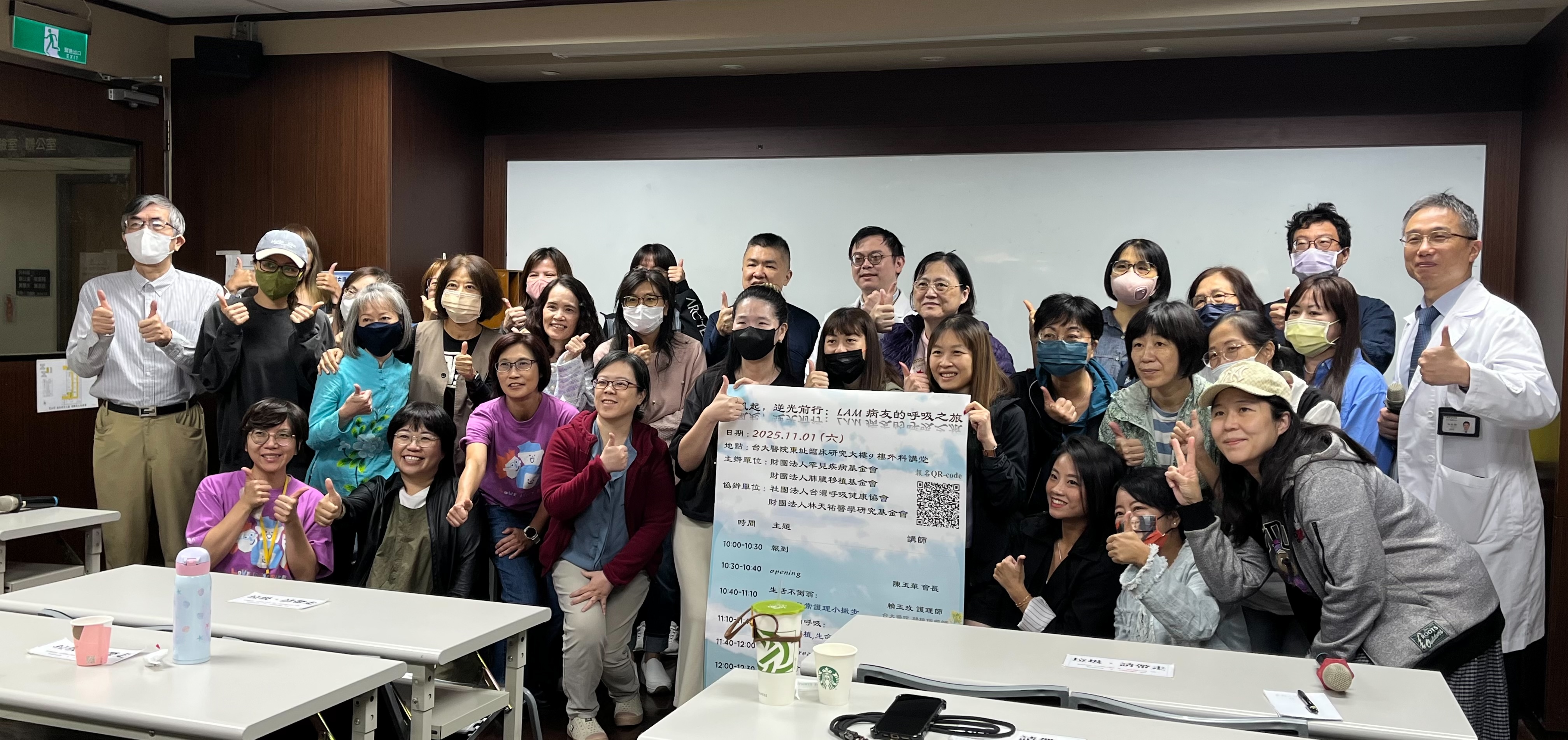 本會自 2014 年起開始辦理 LAM 病友聯誼活動,至今已累計舉辦六次聚會,期盼透過交流機會,讓病友與家庭彼此認識、互相支持。今年在臺大醫院徐紹勳醫師的號召下,與胸腔科團隊共同合作,並召集本會、財團法人肺臟移植基金會、社團法人台灣呼吸健康協會、財團法人林天祐醫學研究基金會等單位支持,於11月1日(六)在臺大醫院舉辦「LAM 病友醫療講座暨聯誼交流」。當天共有 22 位病友、12 位家屬,共計 34 人參加。