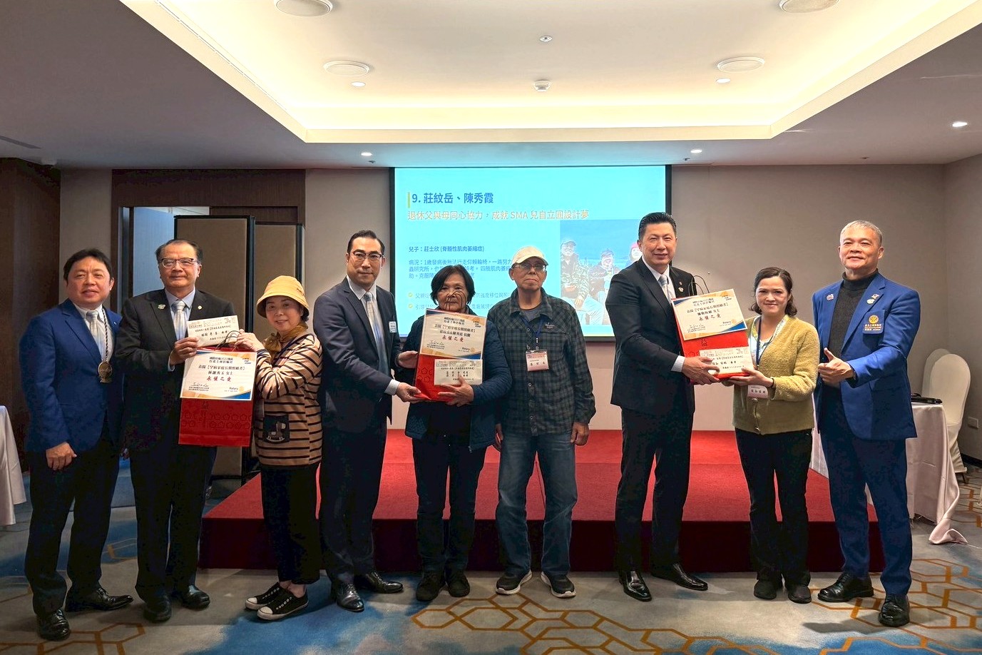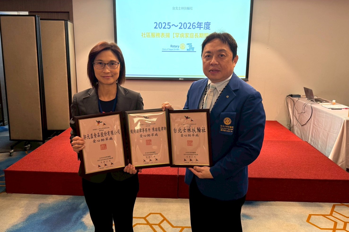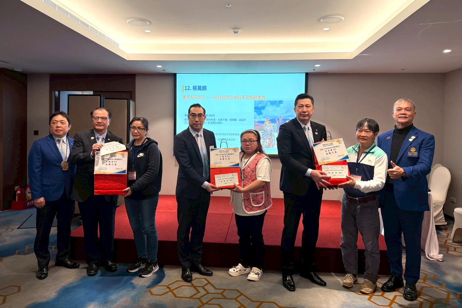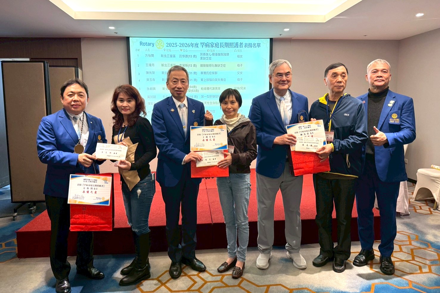 在台灣,將近19,000個罕見疾病家庭,超過240種罕見疾病,7成以上無法治癒,許多照顧者長年累月照顧罹病家人。「走入社區,持續關懷弱勢,發揮社會服務真正效益」為台北士林扶輪社目標之一,自2017年起為感念罕見疾病家庭照顧者辛勞,士林扶輪社每年皆舉辦「罕病家庭照護者表揚大會」,迄今已堂堂邁入第10年,累計超過106個家庭照顧者接受表揚,共計212萬元善款。2月5日(四) 於台北茹曦酒店表揚12位罕病家庭照顧者,本次表揚者有照顧罹病子女多年的年邁雙親或單親媽媽,也有兄弟姊妹皆罹病的大哥獨自照顧他們的感人故事。